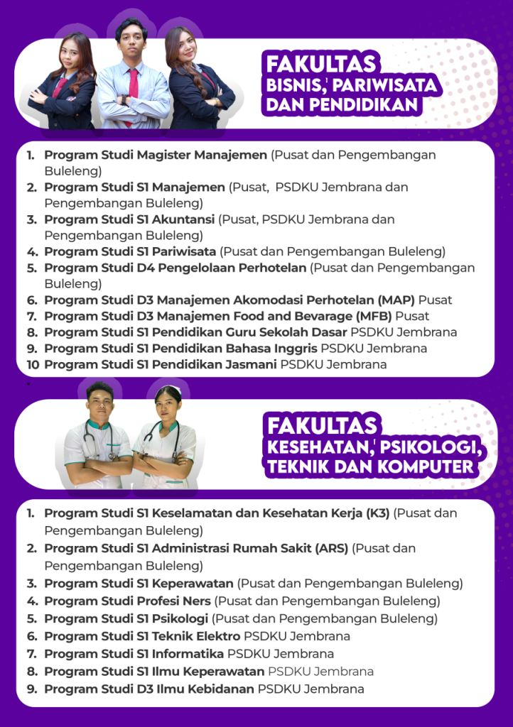 Fakultas Binsis, Pariwisata dan Pendidikan serta Fakultas Kesehatan, Psikologi, Teknik dan Komputer diselenggarakan di kampus Jembrana (PSDKU).