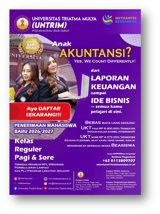 Program Studi Akuntansi di Fakultas Bisnis, Pariwisata, dan Pendidikan Universitas Triatma Mulya merupakan pilihan tepat bagi calon mahasiswa yang ingin mengembangkan kompetensi di bidang akuntansi sekaligus memiliki jiwa kewirausahaan dan daya saing tinggi di dunia kerja.
