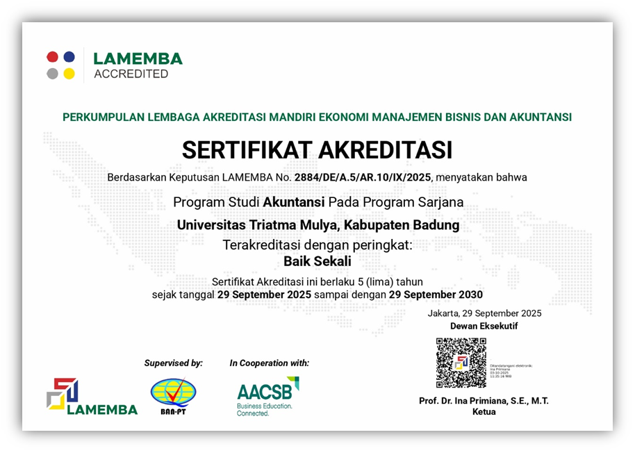 Program Studi Akuntansi telah terakreditasi berdasarkan Keputusan LAMEMBA Nomor: 2884/DE/A.5/AR.10/IX/2025, dengan peringkat: Baik Sekali, berlaku hingga 29 September 2030.